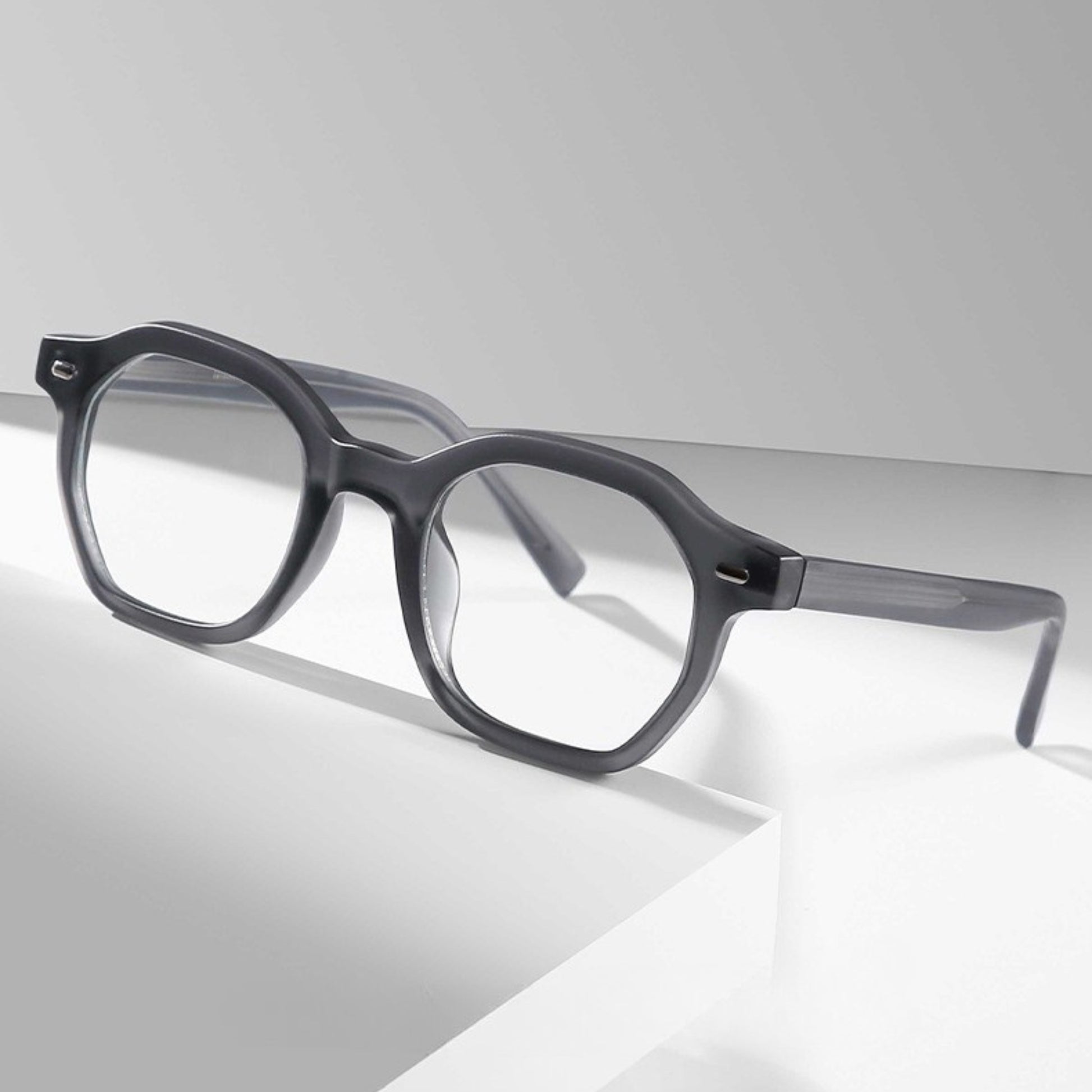 The โGhost Veilโ frame combines a sleek transparent gray tone with edgy polygon angles. Lightweight TR90 and metal details keep it comfortable, while anti-blue light and radiation protection make it perfect for daily wear. Ideal for smaller face shapes and anyone looking for a modern, subtle statement.
